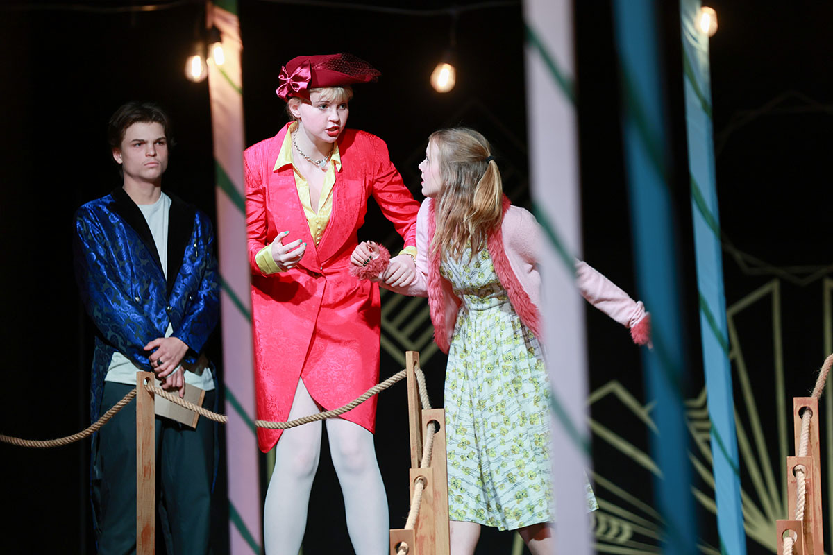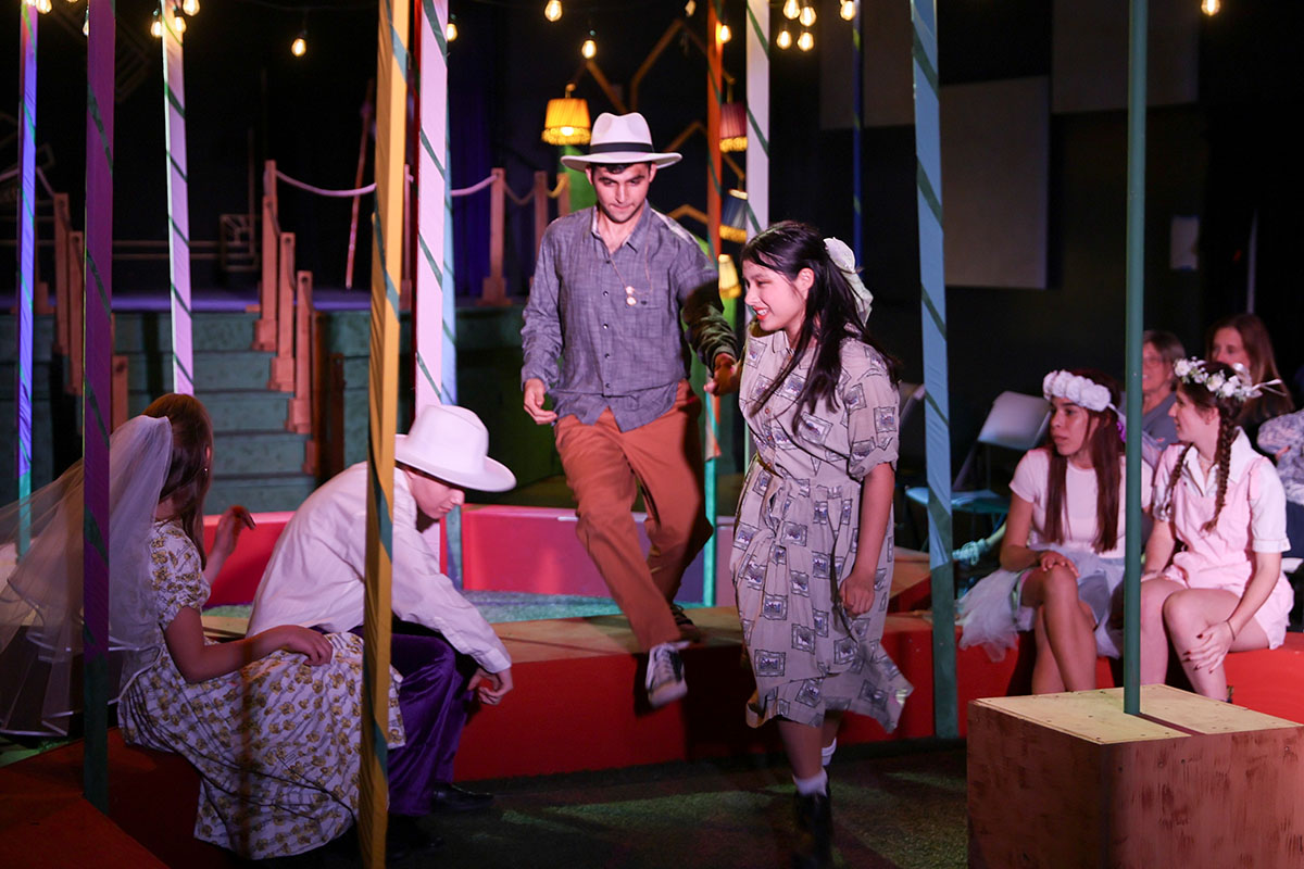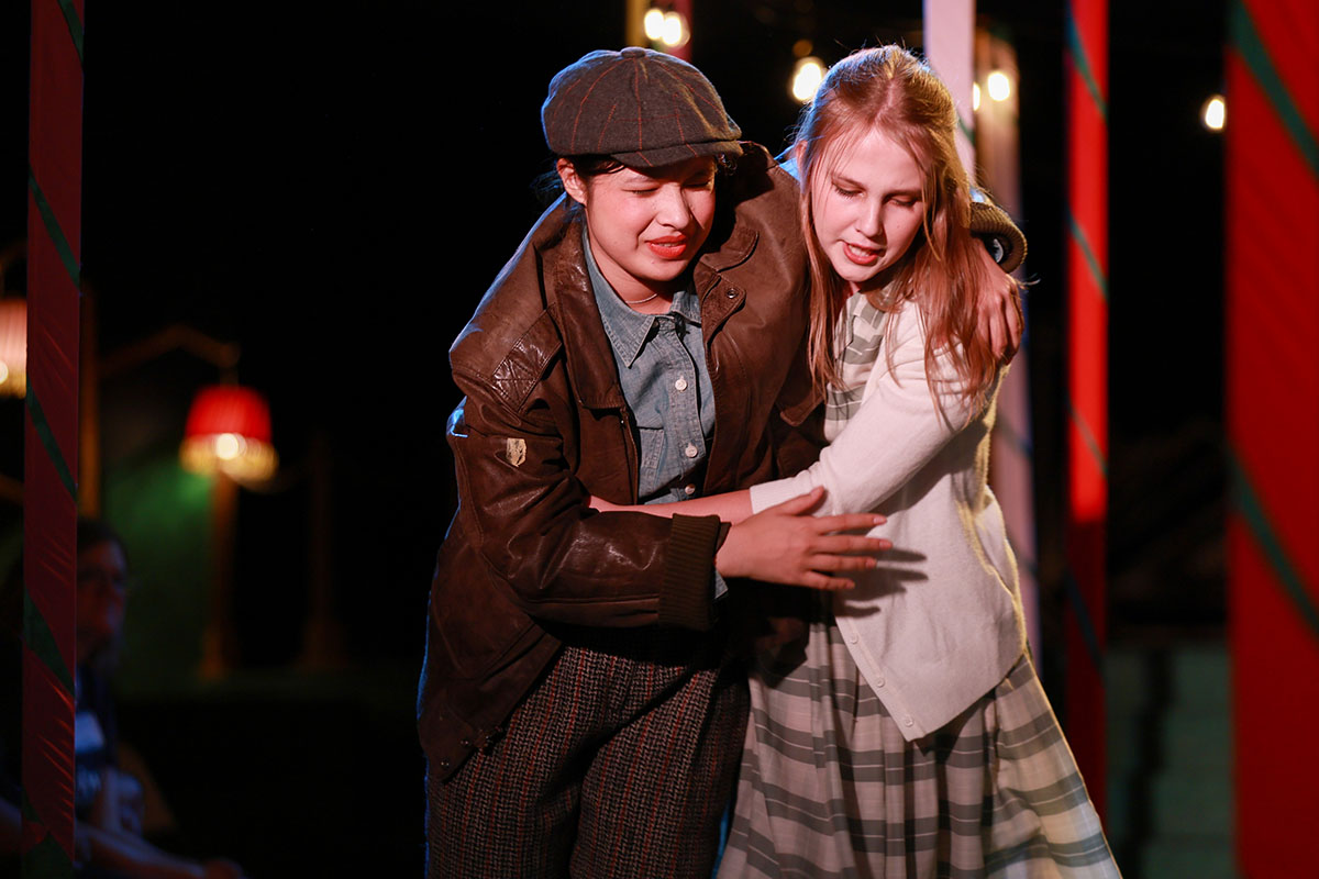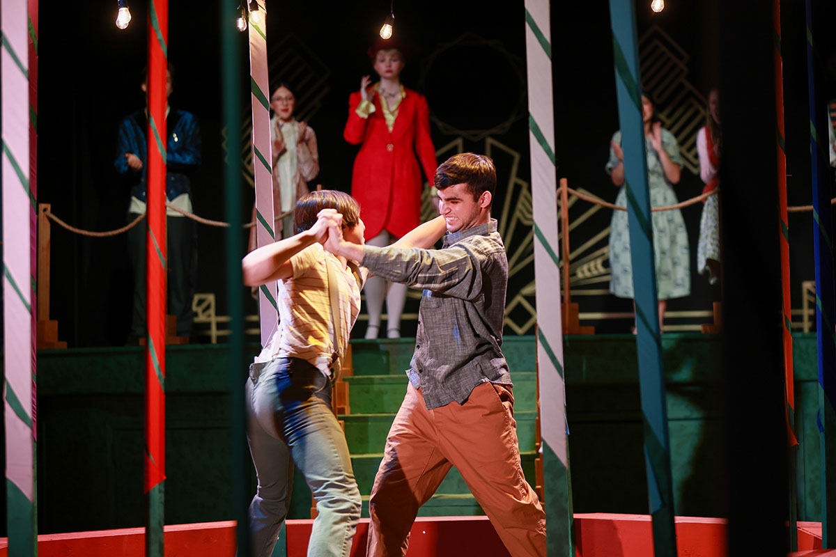 To add to the vibrancy, the show was set to original music, written by composer Elijah Thomas, that evoked the high energy of the Big Band era. In the closing double-wedding scene, the cast performed a lively swing-dance number, choreographed by Joanne Tan, Upper School Science Teacher.