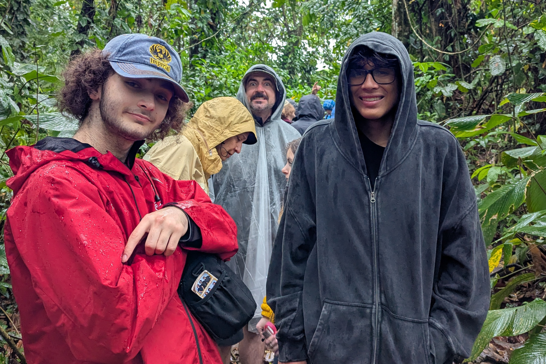 Two students in foreground with teachers in rain gear in background standing in the rainforest