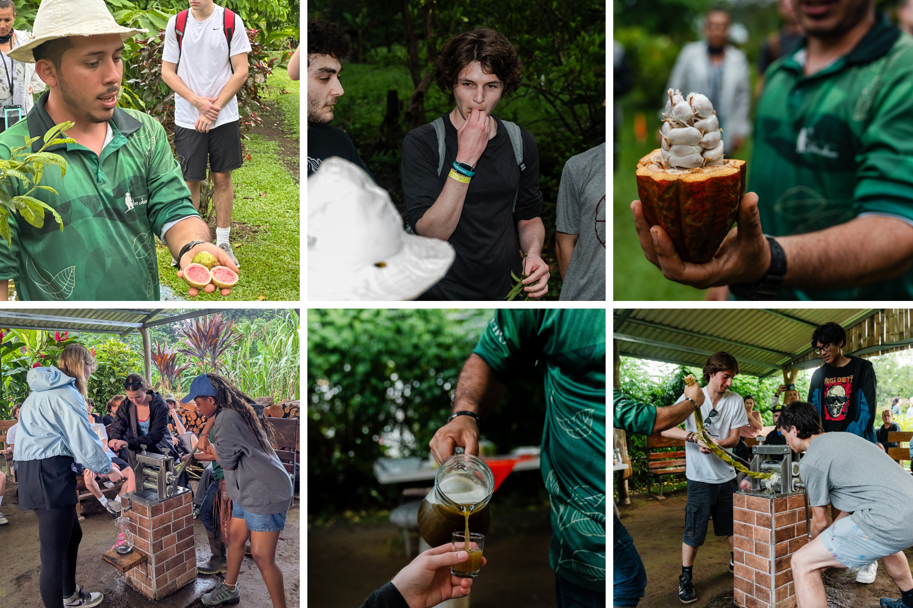 A photo grid featring a close-up of a guide holding fruit, a student tasting plant, a close-up of fruit, two photos of students pressing sugar cane, and a close-up of sugar juice being poured into cup