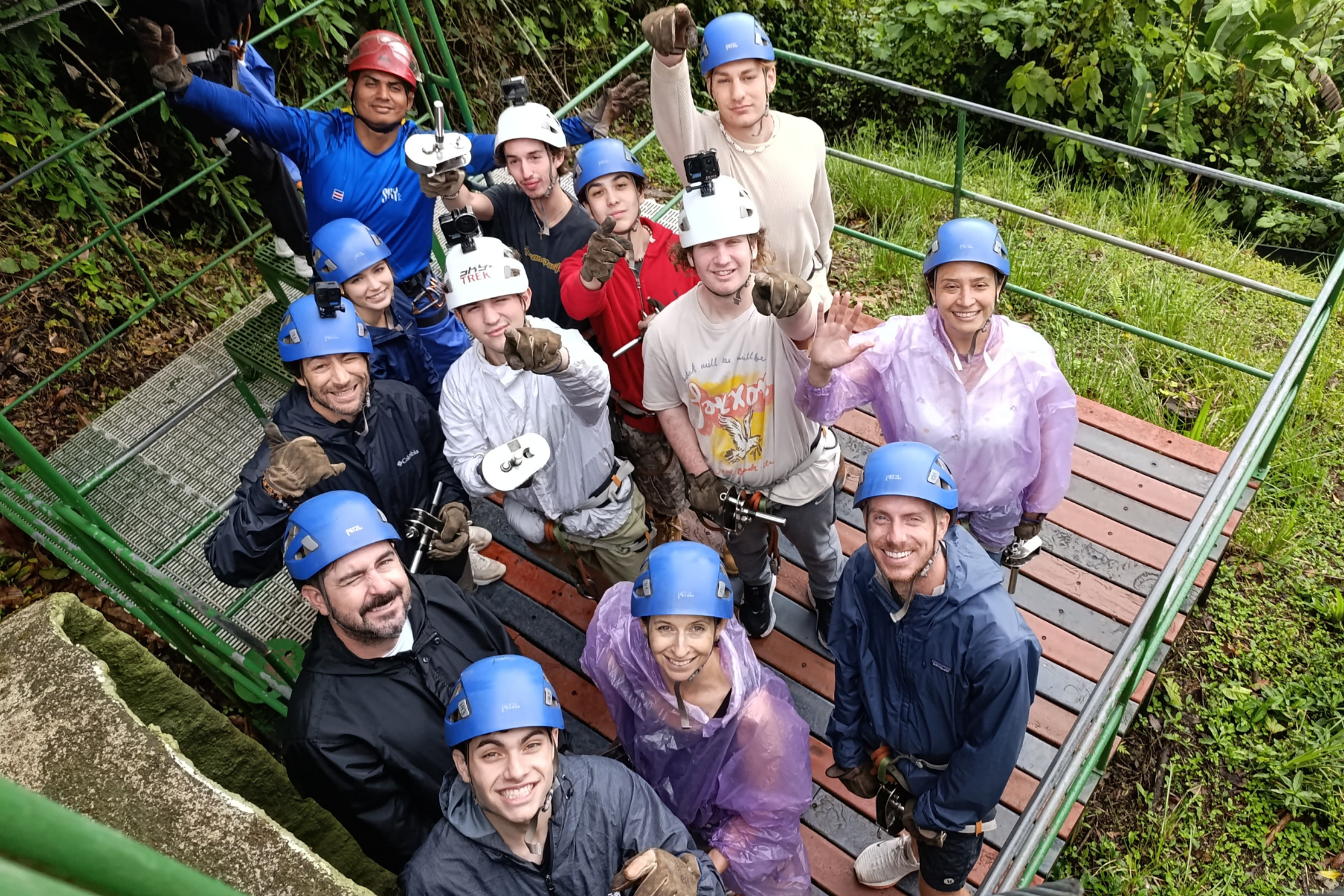 An overhead view of students and teachers wearing helments prepared to zipline