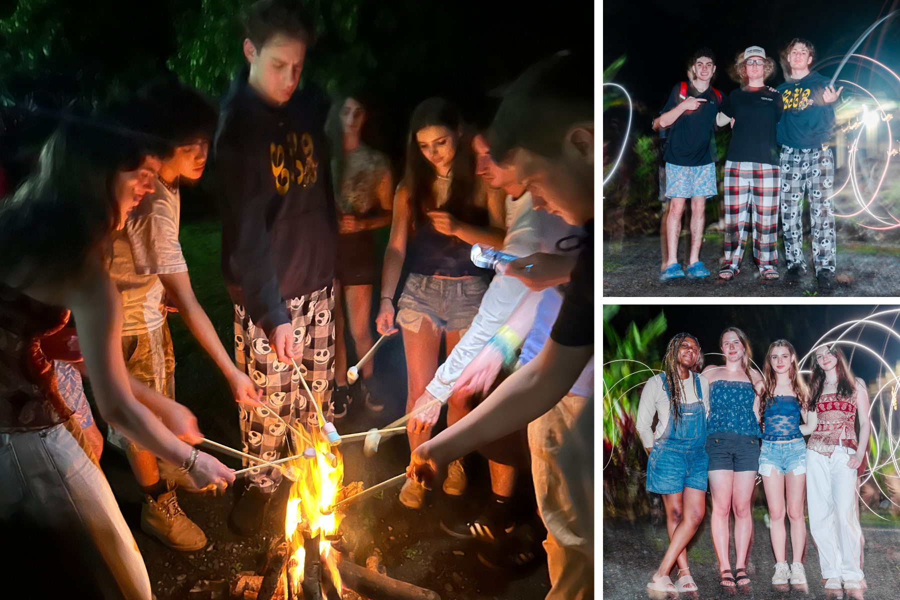 Photo of group of students roasting marshmallows on a small fire and then two photos of teens posing in front of light trails