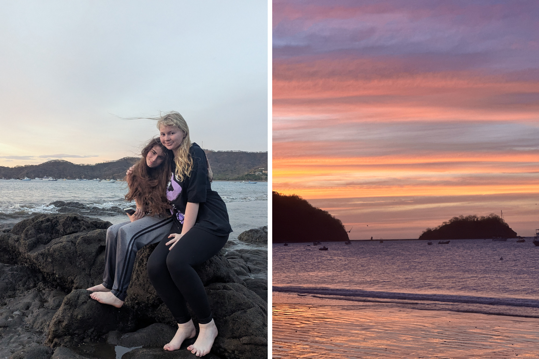 A side-by-side photo grid with two teens sitting on rocks in front of water and a sunset